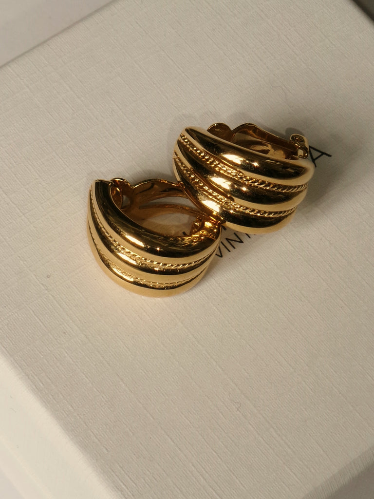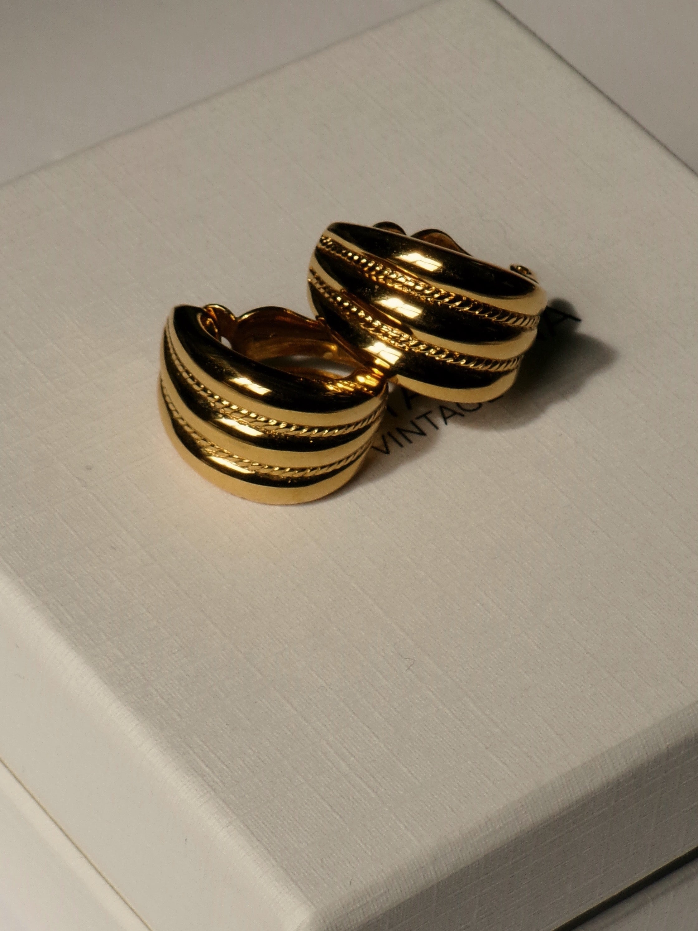 Sculptural and striking, these vintage Givenchy hoops reflect the maison’s enduring elegance. Cast in radiant gold plating, their rounded form is accented with ridged and rope-textured detailing, adding depth and distinction to the design.