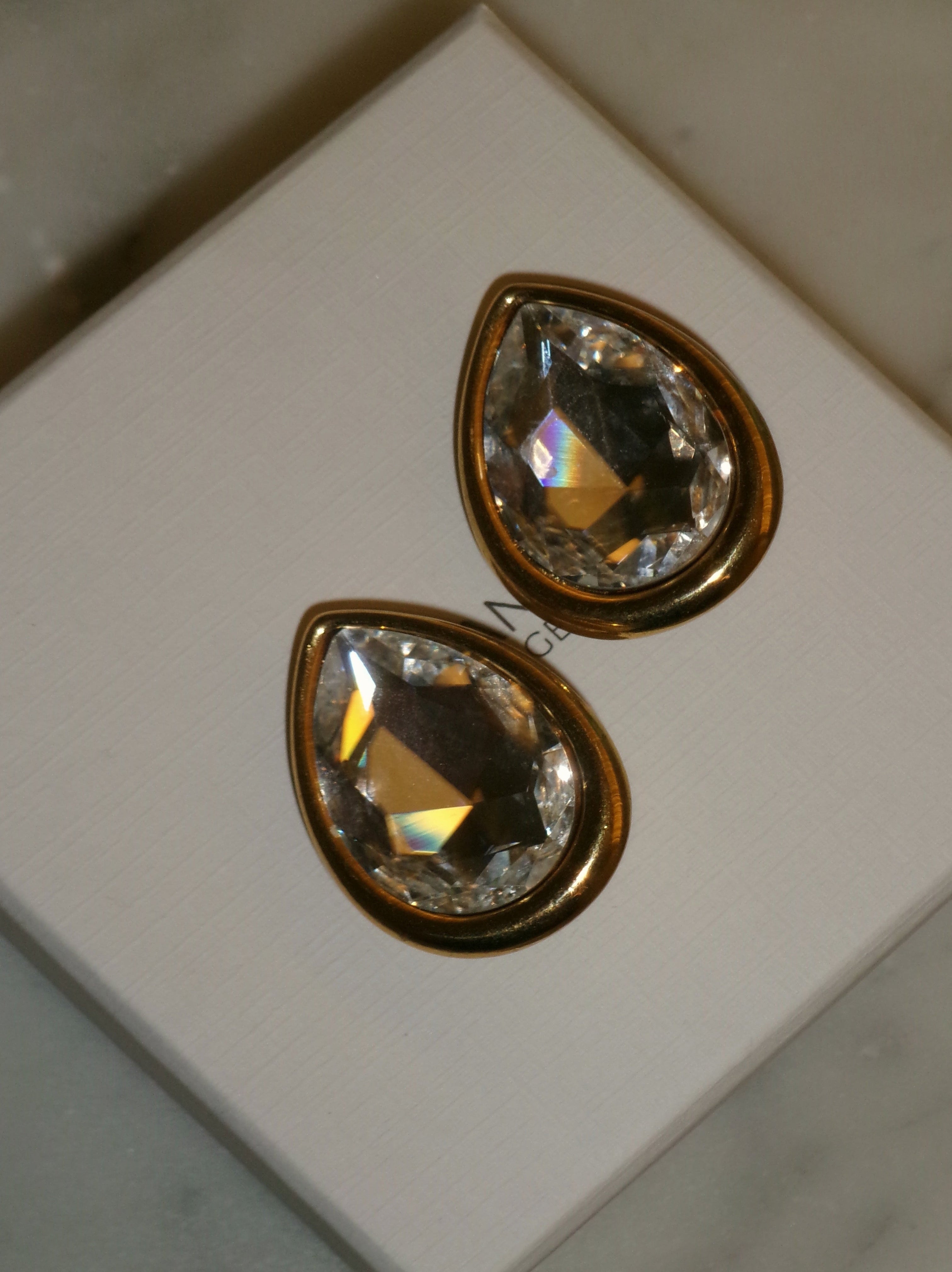 1980's gold plated crystal teardrop clip on earrings. Brand new vintage is backordered and will ship as soon as it is back in stock.
